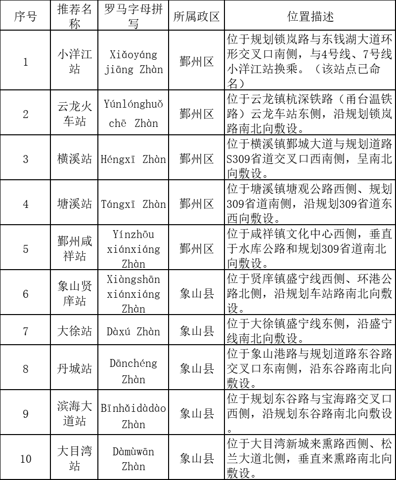 結(jié)合《寧波市域鐵路慈溪線、象山線車(chē)站初步命名公開(kāi)征求意見(jiàn)》,經(jīng)寧波市民政局審批,寧波市軌道交通10號(hào)線(慈溪線)、12號(hào)線(象山線)車(chē)站命名正式公布。